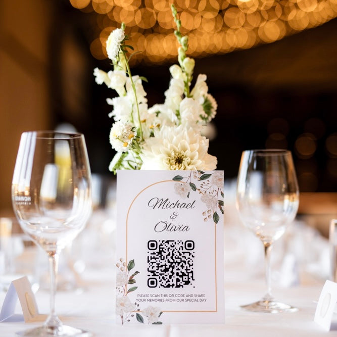 Simply display your QR code at your wedding or event for people to scan and upload their photos and videos. It always helps to mention what the QR code is for, “Please scan the QR code and upload all your amazing photos and videos for the couple to enjoy”.